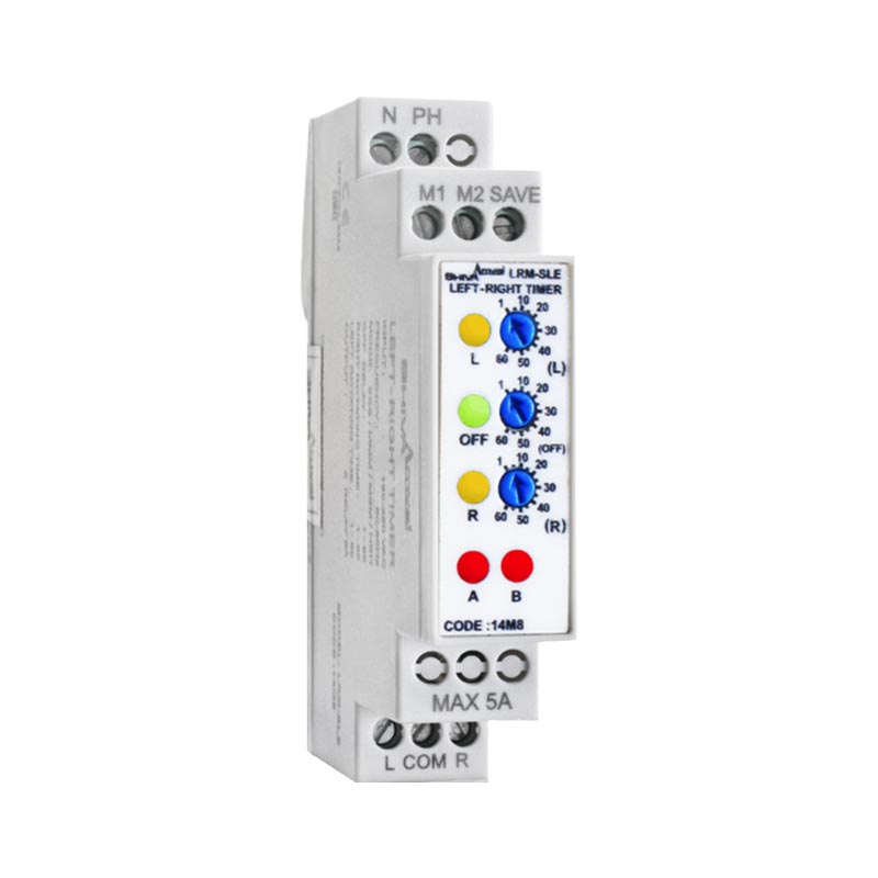 تایمر چپ گرد-راست گرد شیوا امواج سری M با ویژگیهای کاربردی خود، امکان کنترل دقیق و انعطافپذیر حرکت دوار را فراهم میکند. این دستگاه دارای سه نشانگر برای نمایش وضعیت عملکرد است: L (وصل رله چپ گرد)، OFF (استراحت) و R (وصل رله راست گرد). همچنین، دو نشانگر برای نمایش محدوده زمانی انتخاب شده وجود دارد: A روشن (SSS)، B روشن (MMM)، A و B روشن (MSM) و A و B چشمکزن (HSH). این تایمر قابلیت تنظیم زمانهای چپ گرد، استراحت و راست گرد را دارد و چهار محدوده زمانی مختلف را پشتیبانی میکند: SSS (ثانیه، ثانیه، ثانیه)، MMM (دقیقه، دقیقه، دقیقه)، MSM (دقیقه، ثانیه، دقیقه) و HSH (ساعت، ثانیه، ساعت). ویژگیهای دیگر این دستگاه شامل عدم تغییر زمان تنظیم شده در اثر ضربات کنتاکتور تابلو و نگهداری زمان سپری شده در حالت قطع برق در صورت نیاز میباشد.