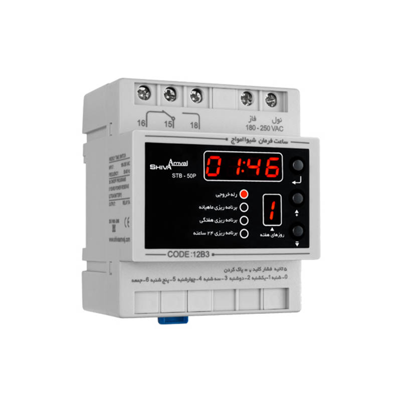 ساعت فرمان ماهیانه 12B3 شیوا امواج، یک دستگاه زمانبندی پیشرفته با یک خروجی فرمان است که به کاربران امکان میدهد تا 50 برنامه زمانبندی مختلف را برای کنترل تجهیزات الکتریکی خود تعریف نمایند. هر برنامه شامل یک زمان روشن و یک زمان خاموش است و میتواند در دورههای زمانی روزانه، هفتگی و ماهیانه تنظیم شود. در حالت روزانه، تنظیمات با دقت ساعت، دقیقه و ثانیه انجام میشود. در حالت هفتگی، علاوه بر ساعت، دقیقه و ثانیه، روزهای هفته نیز قابل تنظیم هستند. در حالت ماهیانه، تنظیمات بر اساس ساعت، دقیقه، ثانیه و روز ماه صورت میگیرد. این ساعت فرمان انعطافپذیری بالایی در برنامهریزی ارائه میدهد؛ در حالت روزانه میتوان روزهای فعال را نسبت به هفته یا ماه تعیین کرد و در حالت ماهیانه نیز میتوان روزهای فعال را نسبت به روزهای هفته مشخص نمود.